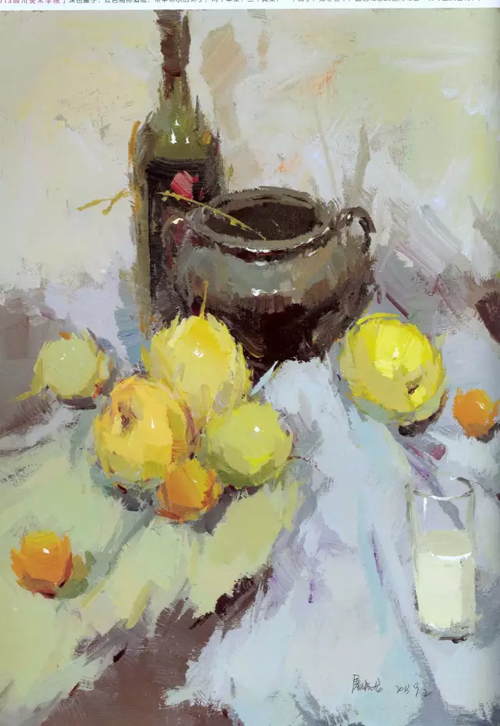 學(xué)會取舍顏色,在動筆之前就要想好整體色調(diào),找顏色時把不符合主色調(diào)的顏色就不要用,只畫與其相協(xié)調(diào)的顏色。(例如水果蔬菜器皿的筆觸要小一些,而后面的襯布最好筆觸大一些,疏密大小的對比襯托出畫面的中心)