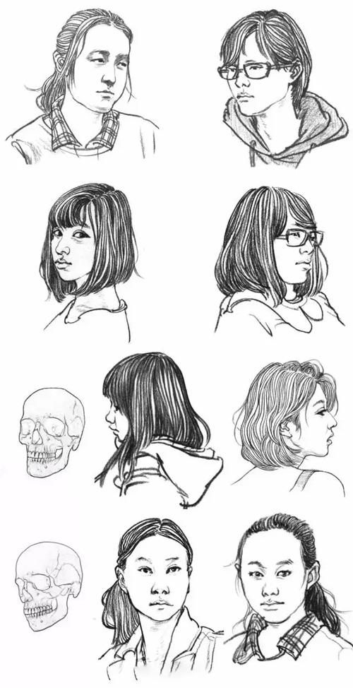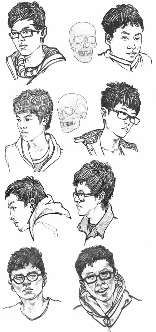 頭部是速寫中較為復(fù)雜的一部分知識點,在人物全身速寫中,它往往起到畫龍點睛的效果。對人物速寫的神情的捕捉,是速寫能力訓(xùn)練中的一個很高的要求,這主要體現(xiàn)在五官的塑造上。