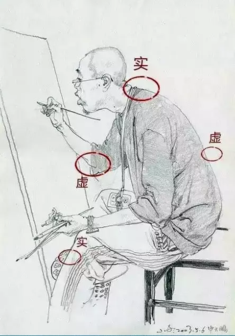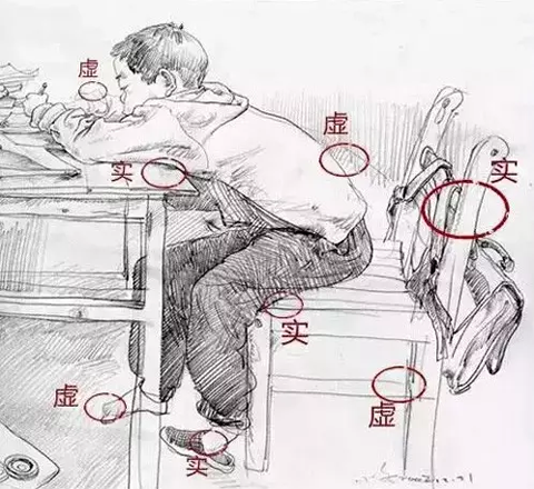 虛實(shí)是為體現(xiàn)畫面空間縱深,為了不讓畫面過于單調(diào),平板。可增強(qiáng)畫面的體積轉(zhuǎn)折。一張好的速寫作品不僅在于比例的準(zhǔn)確、五官的刻畫、動態(tài)的把握。線條的處理也是非常重要的。線條的虛實(shí)變化!