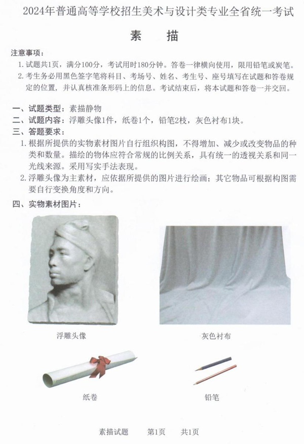 素描考題:素描靜物。浮雕頭像1件,紙卷1個,鉛筆2枝,灰色襯布1塊。
