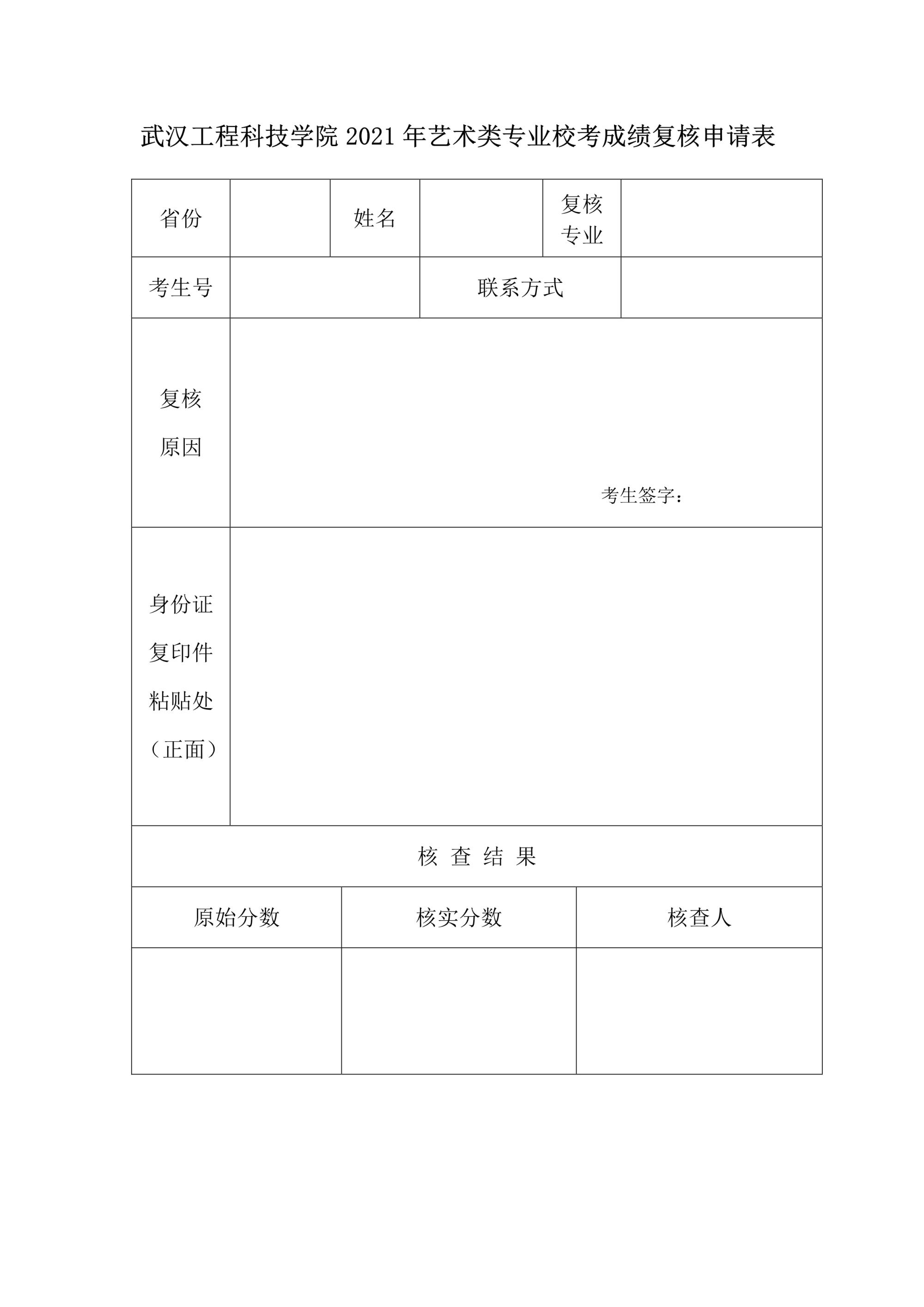 2、考生如對本人考試成績有異議,請于4月25日中午12點(diǎn)之前(逾期不再受理)向我校提出復(fù)核申請。申請方式如下:下載并填寫《武漢工程科技學(xué)院2021年藝術(shù)類專業(yè)??汲煽儚?fù)查申請表》,按照表格要求粘貼身份證、準(zhǔn)考證,簽字后掃描或拍照(請保持畫面清晰)發(fā)送到郵箱81088987@qq.com(不接受現(xiàn)場復(fù)查手續(xù)辦理)。學(xué)校收到復(fù)查申請后,招生處將在我校紀(jì)檢監(jiān)察部門監(jiān)督下對提出復(fù)核申請的成績進(jìn)行復(fù)核,在兩個工作日內(nèi)予以電話或郵件回復(fù)結(jié)果(成績復(fù)核只復(fù)核是否存在漏評、漏閱、登錯分,不重新評卷,不涉及評分標(biāo)準(zhǔn)寬嚴(yán)程度的掌握)。