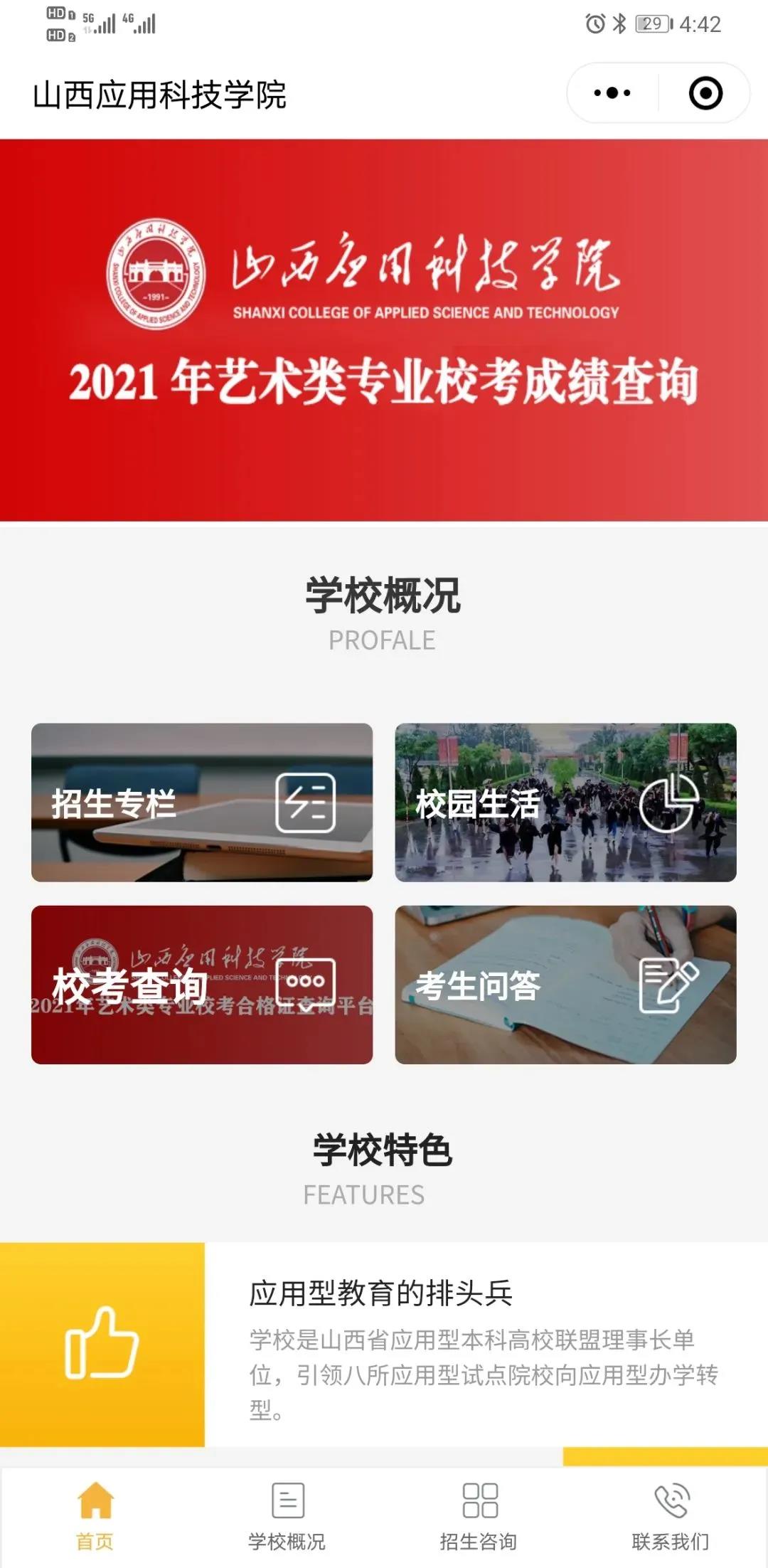 1.查詢方法:搜索微信小程序:山西應(yīng)用科技學(xué)院,點(diǎn)擊飄窗“2021年藝術(shù)類專業(yè)校考成績查詢平臺(tái)”進(jìn)入查詢頁面,輸入姓名、證件號(hào)查詢。2.查詢時(shí)間:2021年4月29日—2021年5月30日