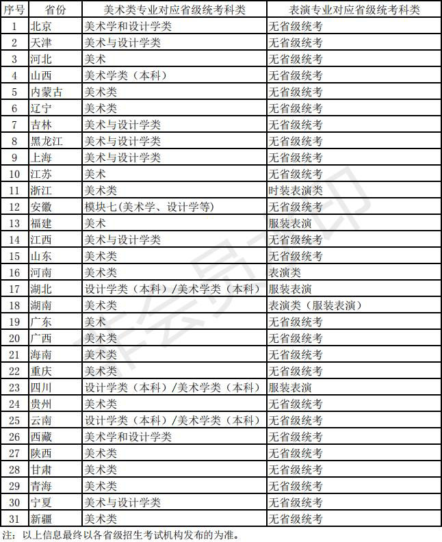 北京服裝學(xué)院2022年藝術(shù)類本科專業(yè)考試省級統(tǒng)考科類對照表