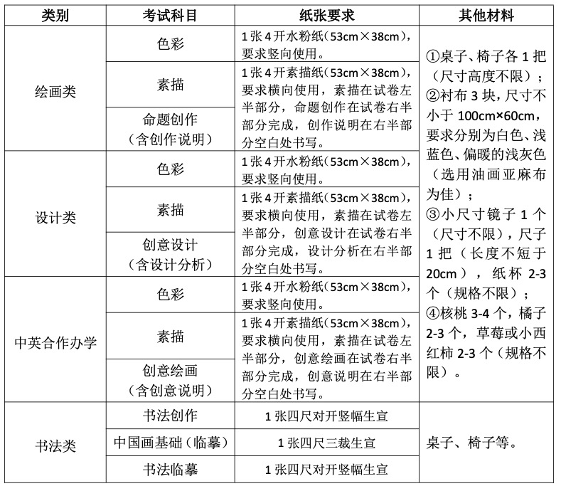 1.素描只允許使用黑色鉛筆、黑色炭筆;色彩使用水粉、丙烯、水彩均可,不允許使用油畫顏料;命題創(chuàng)作(創(chuàng)意設(shè)計(jì)、創(chuàng)意繪畫)使用馬克筆、彩色鉛筆、水粉、丙烯、水彩、黑色鉛筆、炭筆均可,不允許使用油畫顏料;書法創(chuàng)作、書法臨摹使用毛筆、墨汁、硯、畫氈;中國畫基礎(chǔ)(臨摹)使用毛筆、中國畫顏色、墨汁、畫氈。