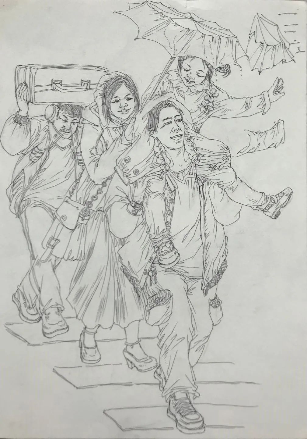 表達難點:行走的人物之間組合結(jié)構(gòu)就容易過于簡單平行。這個時候就需要同學(xué)們對人物進行高低錯落,疏密安排。以及人物形象的服飾的表達為側(cè)重。還可以加不同天氣等因素。總兒言之這些還是生活中的體驗。