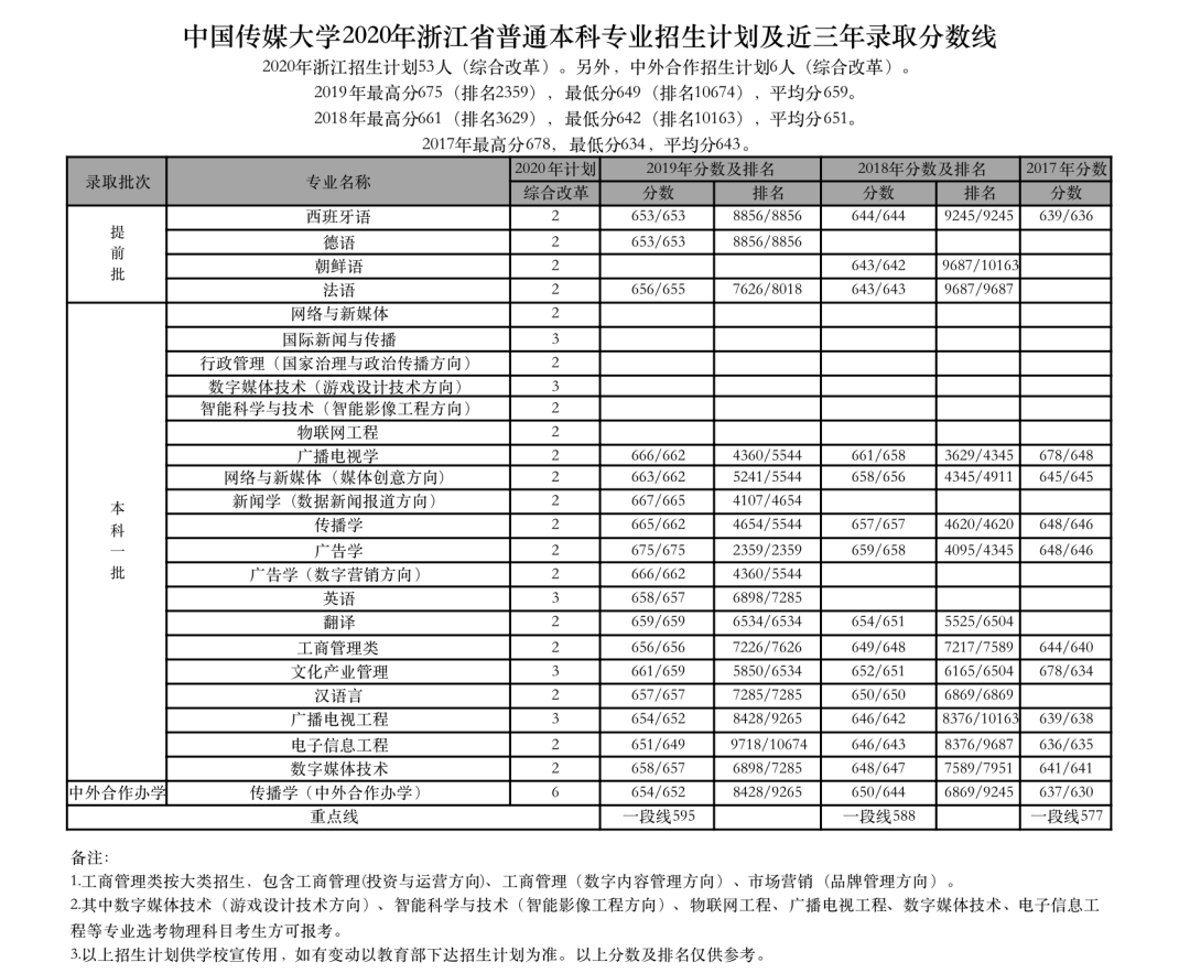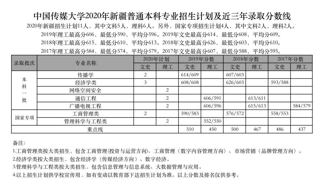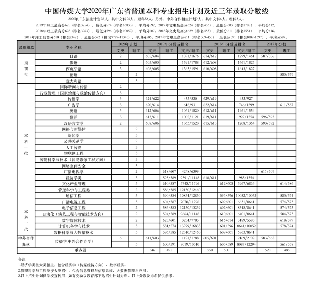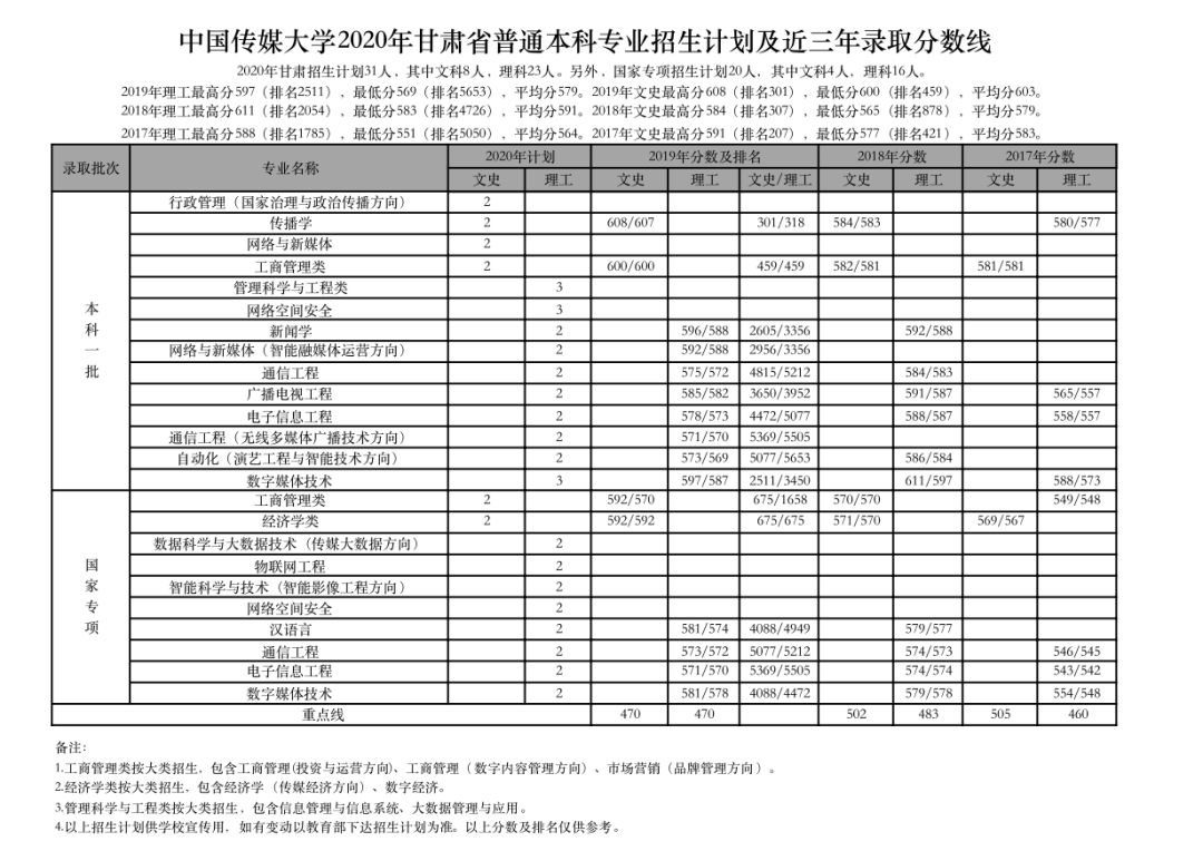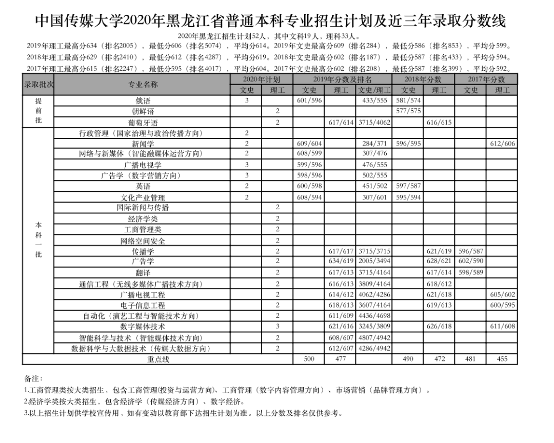 中國傳媒大學2020年各?。ㄖ陛犑小⒆灾螀^(qū))招生計劃表正式發(fā)布,其中包括今年的招生計劃(提前批、本科一批、國家專項、中外合作辦學),近三年的錄取分數(shù)統(tǒng)計、排名情況