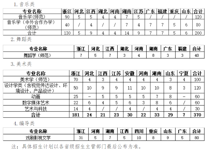 我校今年藝術(shù)類計(jì)劃招生690名。藝術(shù)類分文理科的省份僅面向藝術(shù)文科類(“3+1+2”模式省份為歷史類)考生招生,不分文理科(或不分科目類)的省份不作文理科報(bào)考要求,分省分專業(yè)計(jì)劃如下: