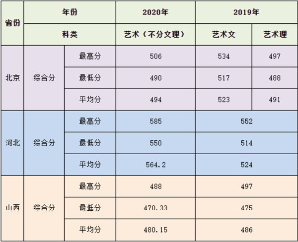 注:北京、山西2019-2020年綜合分為美術(shù)統(tǒng)考成績/300*750*50%+高考文化課成績(含政策性加分)*50%;河北2020年綜合分為美術(shù)統(tǒng)考成績/300*750*70%+高考文化課成績(含政策性加分)*30%,2019年綜合分為美術(shù)統(tǒng)考成績/300*750*50%+高考文化課成績(含政策性加分)*50%。
