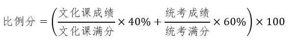 在實行平行志愿的省份,按照投檔成績從高到低的順序擇優(yōu)錄取。在實行順序志愿的省份,按照比例分(四舍五入、保留小數(shù)點后兩位)從高到低的順序擇優(yōu)錄取。比例分滿分為100分,計算公式為: