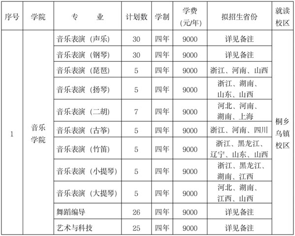 【注】:1.音樂表演(聲樂)專業(yè)擬面向浙江、安徽、福建、河北、黑龍江、湖北、湖南、江蘇、江西、遼寧、山東、山西、四川等13個(gè)省份招生,專業(yè)成績承認(rèn)相應(yīng)省統(tǒng)考成績。