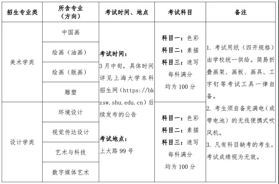 美術(shù)學(xué)類【中國(guó)畫、繪畫(油畫)、繪畫(版畫)、雕塑】、設(shè)計(jì)學(xué)類【環(huán)境設(shè)計(jì)、視覺(jué)傳達(dá)設(shè)計(jì)、藝術(shù)與科技、數(shù)字媒體藝術(shù)】專業(yè)投檔至上海大學(xué)的考生: