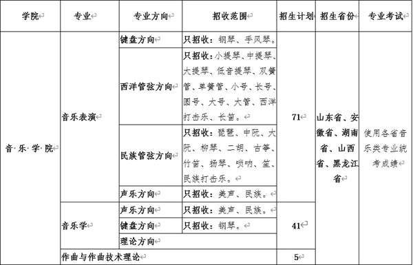 山東省內(nèi):山東省教育招生考試院按藝術(shù)類投檔規(guī)則向我校投檔,入檔考生我校將按照專業(yè)志愿優(yōu)先的原則,根據(jù)專業(yè)統(tǒng)考成績(jī)由高到低擇優(yōu)錄取。若專業(yè)統(tǒng)考成績(jī)相同,依次比對(duì)高考文化成績(jī)、高考文化成績(jī)位次,成績(jī)或位次排序靠前者優(yōu)先錄取。其中報(bào)考音樂(lè)學(xué)(理論方向)專業(yè)的考生,其高考文化課成績(jī)須達(dá)到400分以上(含400分),未達(dá)到者不予錄取。專業(yè)主項(xiàng)不在招收范圍的考生,將退檔不予錄取。