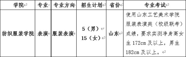 04、報(bào)考音樂(lè)與舞蹈類專業(yè)考生的專業(yè)主項(xiàng)須符合我校公布的專業(yè)(方向)招收范圍,山東省考生報(bào)考表演(服裝表演方向)專業(yè)需校級(jí)聯(lián)考成績(jī)合格,且考生實(shí)測(cè)凈身高符合要求。