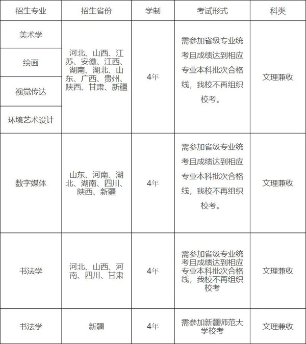 全國共計擬招生254人,面向河北、山西、江蘇、安徽、江西、湖南、湖北、四川、河南、山東、廣西、貴州、陜西、甘肅、新疆等15個省(自治區(qū))招生,需參加省級專業(yè)統(tǒng)考且成績達到相應(yīng)專業(yè)本科批次合格線,除新疆報考書法學(xué)專業(yè)的考生,我校不再組織???。