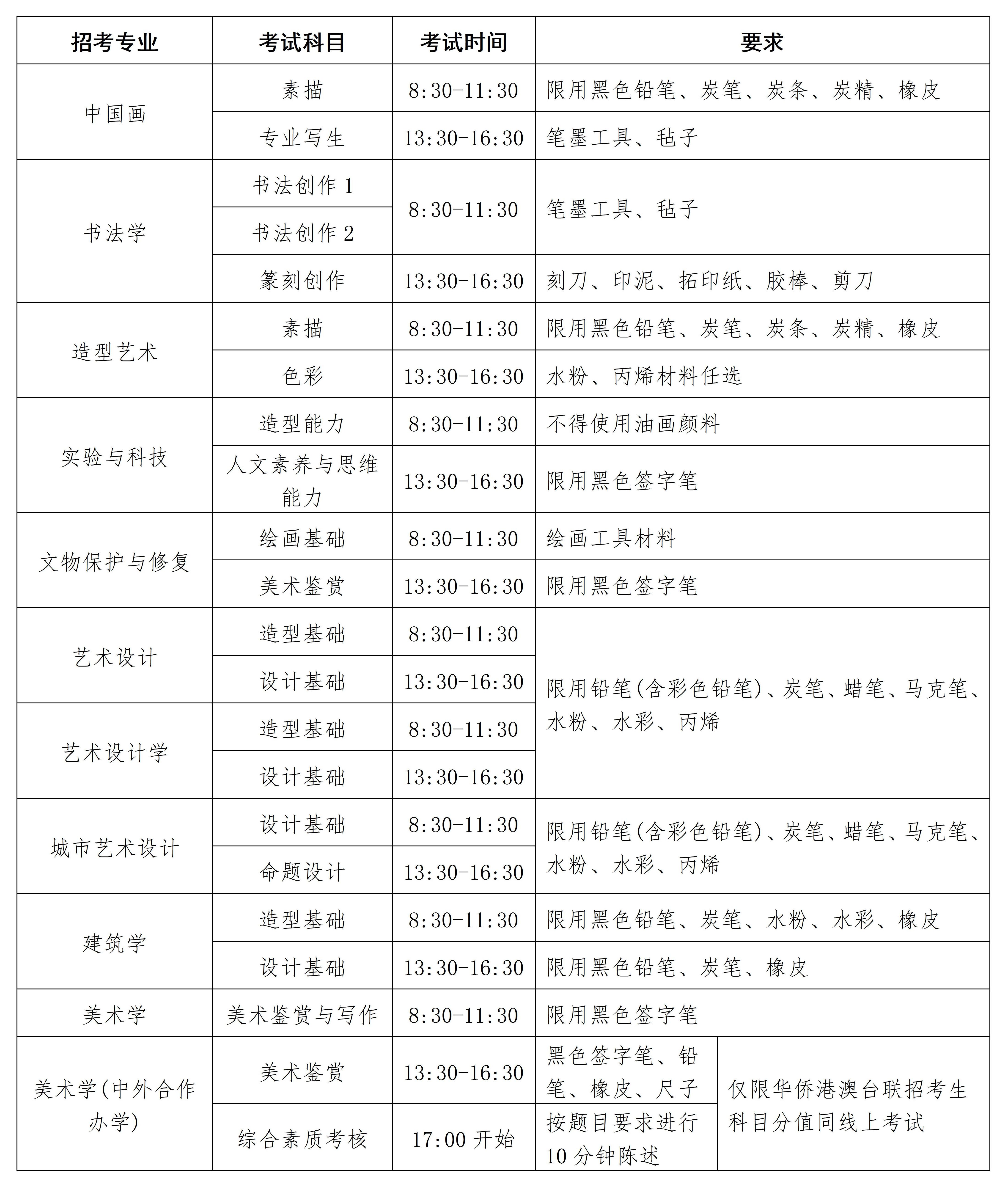(1)中國(guó)畫(huà)、書(shū)法學(xué)、造型藝術(shù)、實(shí)驗(yàn)與科技、文物保護(hù)與修復(fù)、藝術(shù)設(shè)計(jì)、城市藝術(shù)設(shè)計(jì)專(zhuān)業(yè)考生文化課成績(jī)不低于生源省市普通類(lèi)專(zhuān)業(yè)本科(文/理)批次錄取控制分?jǐn)?shù)線。