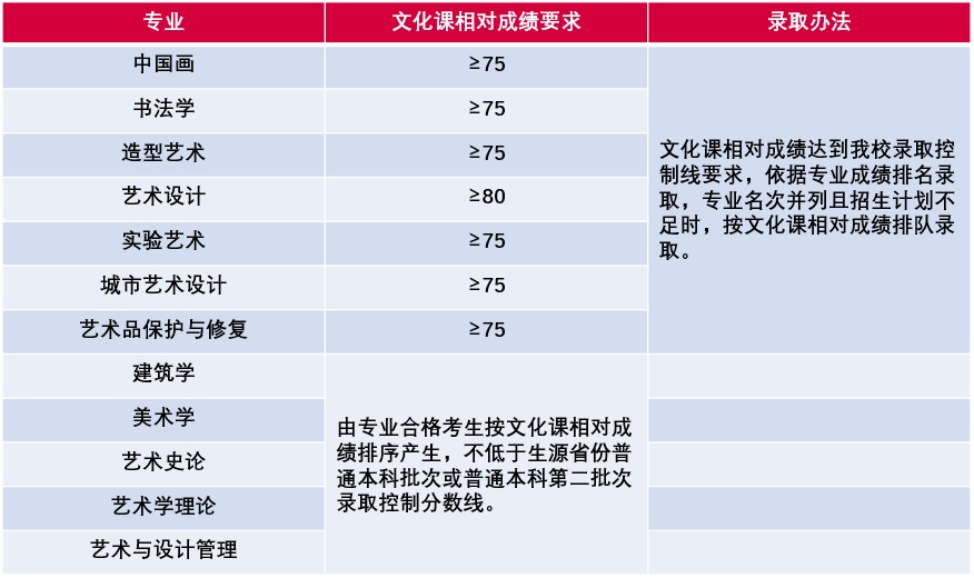 3)建筑學、美術(shù)學、藝術(shù)史論、藝術(shù)學理論、藝術(shù)與設(shè)計管理專業(yè)分數(shù)線由專業(yè)合格考生按文化課相對成績排序產(chǎn)生,最低不低于生源省份普通本科批次或普通本科第二批次錄取控制分數(shù)線。