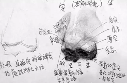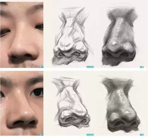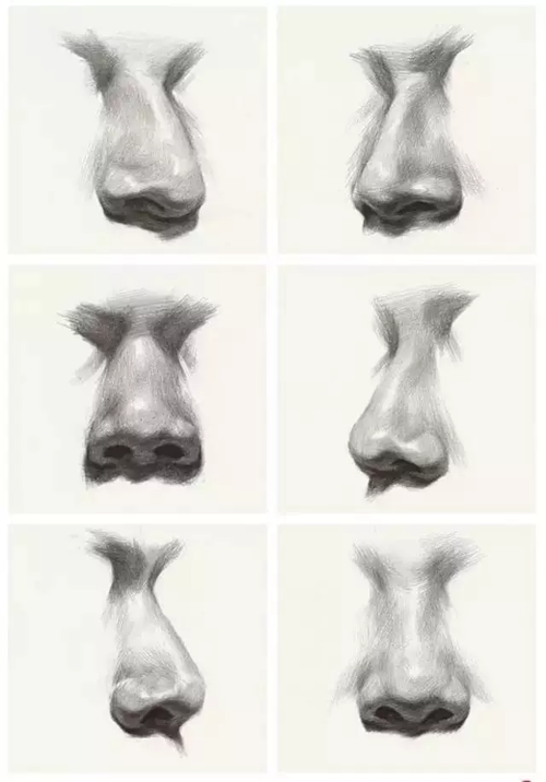 在頭像里,無論你挑哪種角度、哪種透視,你都會覺得鼻頭永遠都是對著你的。作為臉部比較中心的一個五官,它的地位不用多說,對于形體變化和關(guān)系的考究相對嚴格些。