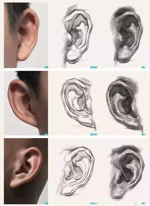我的學生常說:耳朵最好畫了,隨便搞搞就行了。我的老師常說:耳朵是后娘生的嗎?以至于它如此不受重視?作為頭部比較靠后的五官之一,耳朵并不是我們大多數(shù)理解的那樣,應(yīng)是簡練而不簡單、豐富而不繁瑣。還是那句話:抓住重點和細節(jié)。