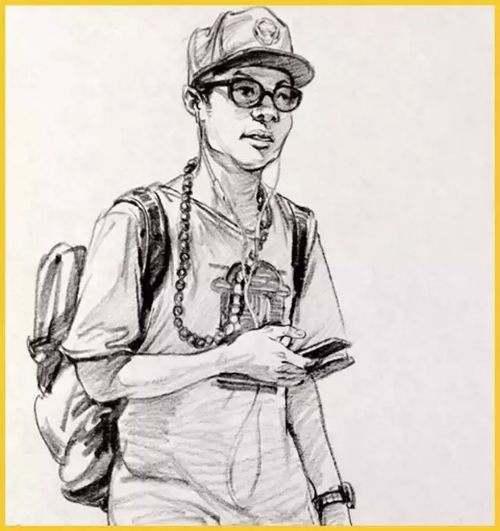 道具:道具的刻畫表現(xiàn),是根據(jù)物體最有代表性的取舍,詳細或者簡單根據(jù)大家畫面所需求表現(xiàn)。但在單人速寫中加入道具之后,表現(xiàn)的難度就加倍了。在構圖的過程中要思考人物與物體之間的比例大小,以及他們之間的關系,學會從不同的角度分析、觀察、理解和表現(xiàn)對象。