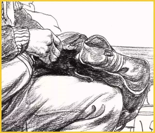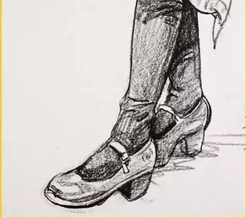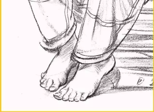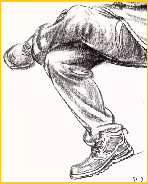 腿部:腿部無論從正面還是從側面看,輪廓都不是直的,而是高低起伏的曲線。所以腿部衣紋的表現(xiàn)要與大腿的結構轉折和運動方向一致,同時注意表現(xiàn)手法的多樣性。膝關節(jié)部位是腿部產(chǎn)生衣紋的關鍵點,通常支起的膝蓋部位形成了凸出的點,衣紋以此為核心,向大、小腿方向以長短、寬窄不同的褶紋呈放射狀擴散。畫腳要注意其外形及與腿的上下貫通,腿與腳不必分開畫。