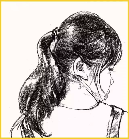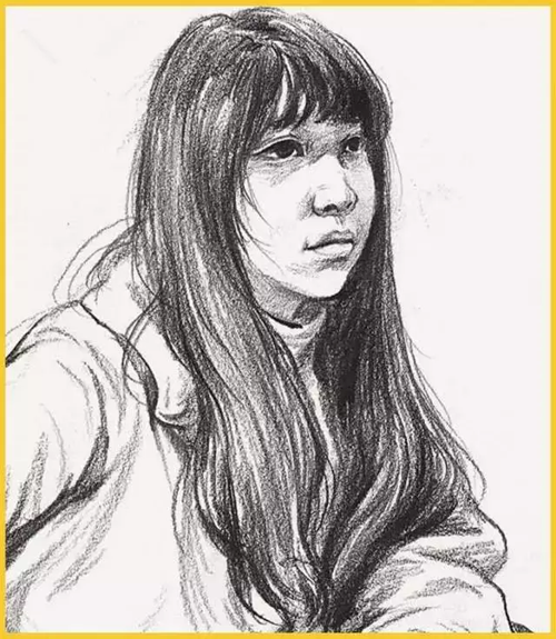 頭發(fā):由于頭發(fā)質感柔順,生長的位置不一樣,頭骨的形狀起伏,所以畫頭發(fā)要分好組,一組一組的畫出大面積的轉折關系,用筆要松動輕盈。