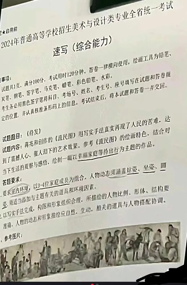 試題內(nèi)容:近代畫家蔣兆的《流民圖》用寫實(shí)手法真實(shí)再現(xiàn)了人民的苦難,達(dá)到震撼人心、崔然淚下的藝術(shù)效果。參照《流民圖》的繪畫特點(diǎn),結(jié)合對(duì)當(dāng)代生活的觀察和感悟,繪制一幅以幸福家庭等待出行為主題的作品。