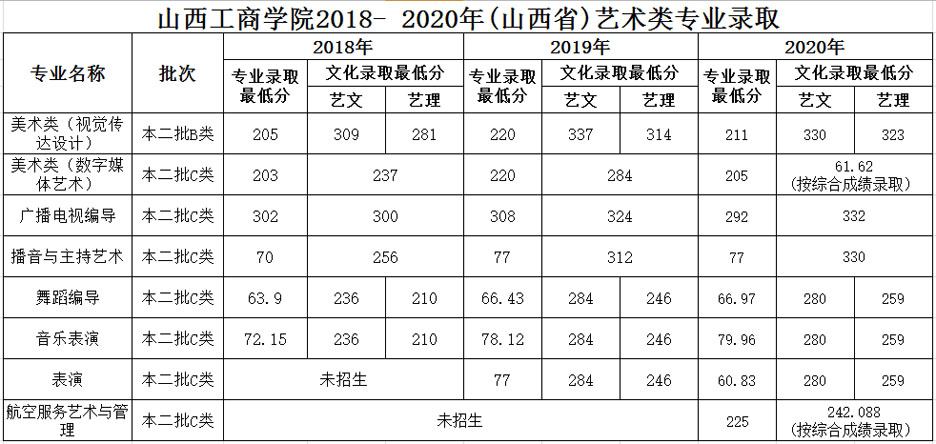 山西工商學(xué)院2018-2020年山西省藝術(shù)類本科專業(yè)錄取分?jǐn)?shù)線