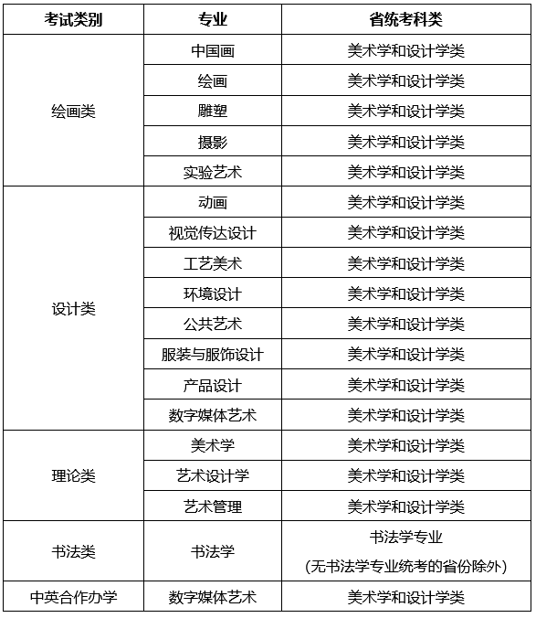 二、本科招生專業(yè)考試各專業(yè)對應(yīng)考試類別及省統(tǒng)考科類如下: