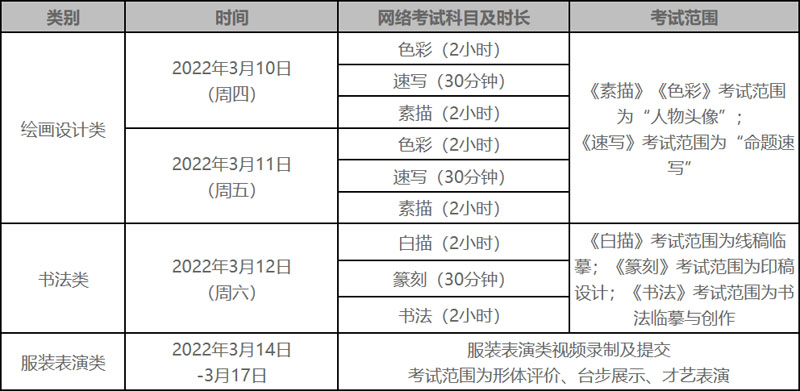 備注:省外繪畫(huà)設(shè)計(jì)類(lèi)考試日期為3月10日、11日,考生可選擇其中一天考試,我校將設(shè)置單日考試容量,并做實(shí)時(shí)調(diào)整。