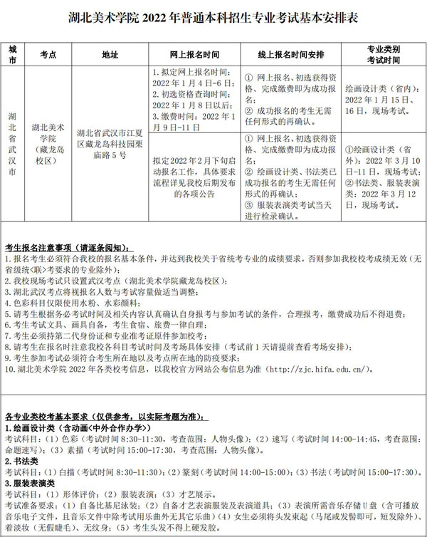第十八條 每名考生在所報考類別均限一場。校考考試時間、地點及安排、考試科目等要求詳見《湖北美術(shù)學(xué)院2022年普通本科招生專業(yè)考試基本安排表》。各專業(yè)簡介請登錄我校官(http://www.hifa.edu.cn/)查詢。